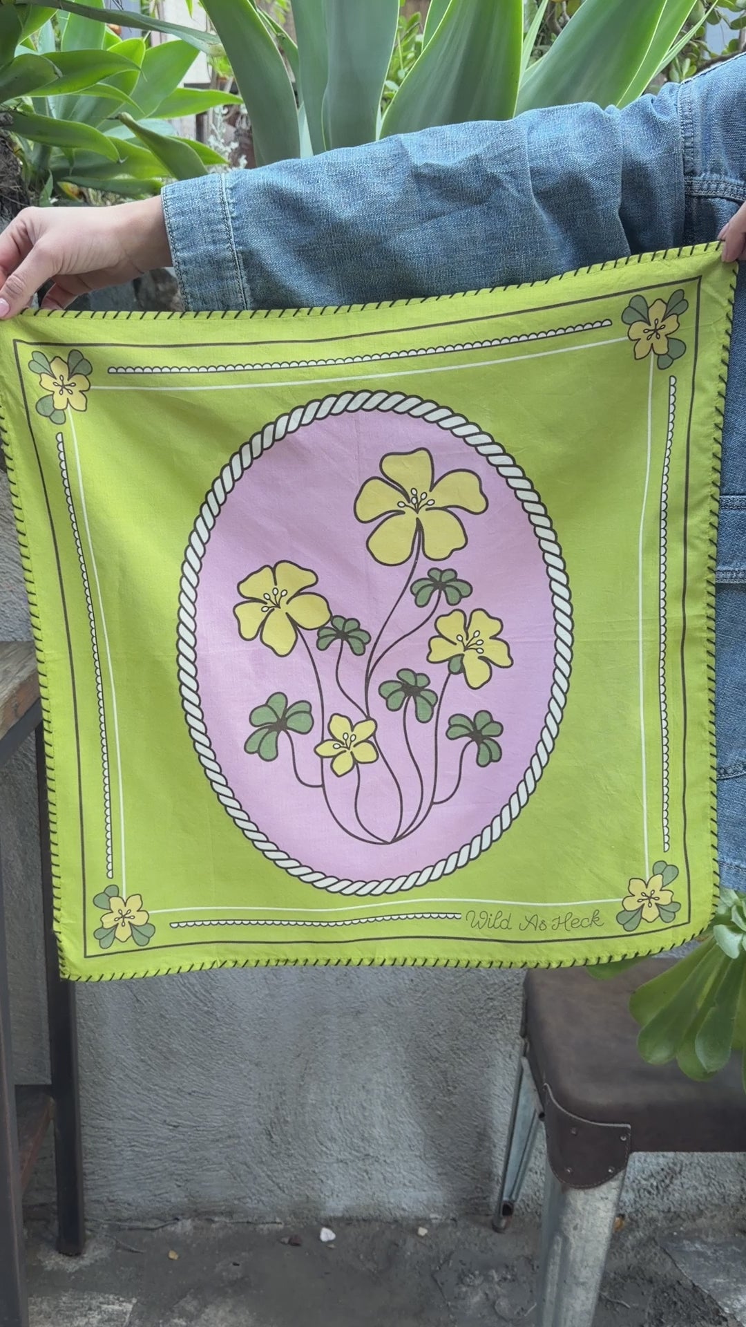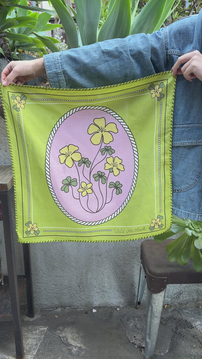 The Sour Grass bandana is hand screen printed in India. Hand whip stitch detailing around the edge!
