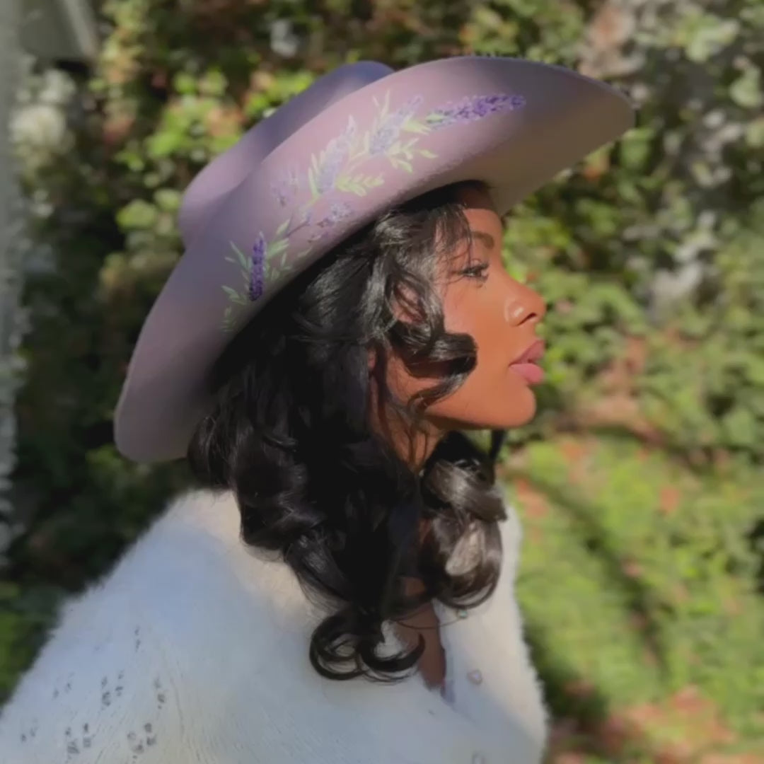 The Colette Western features artwork by Leni Lupin on a bold cowboy silhouette. Each hat is a one-of-a-kind piece of wearable art.