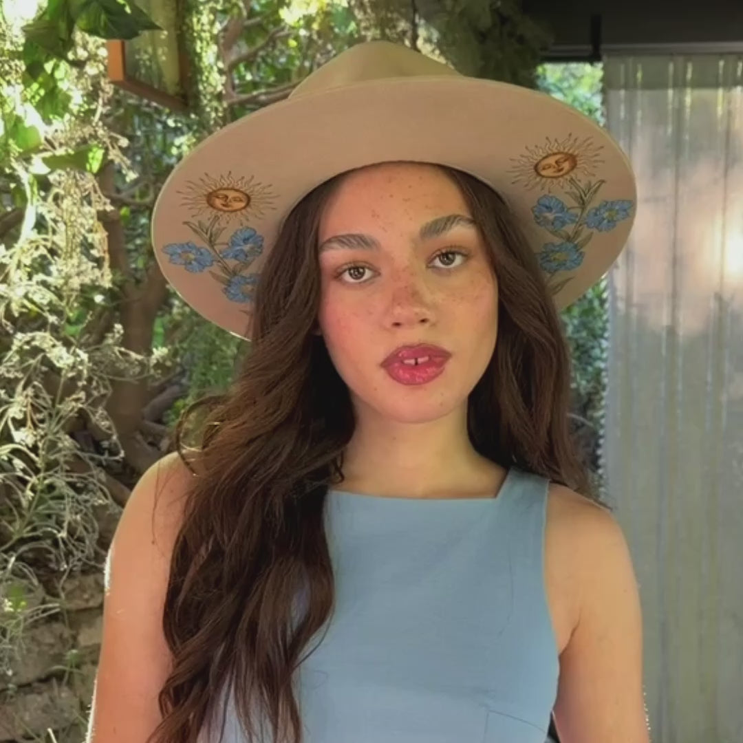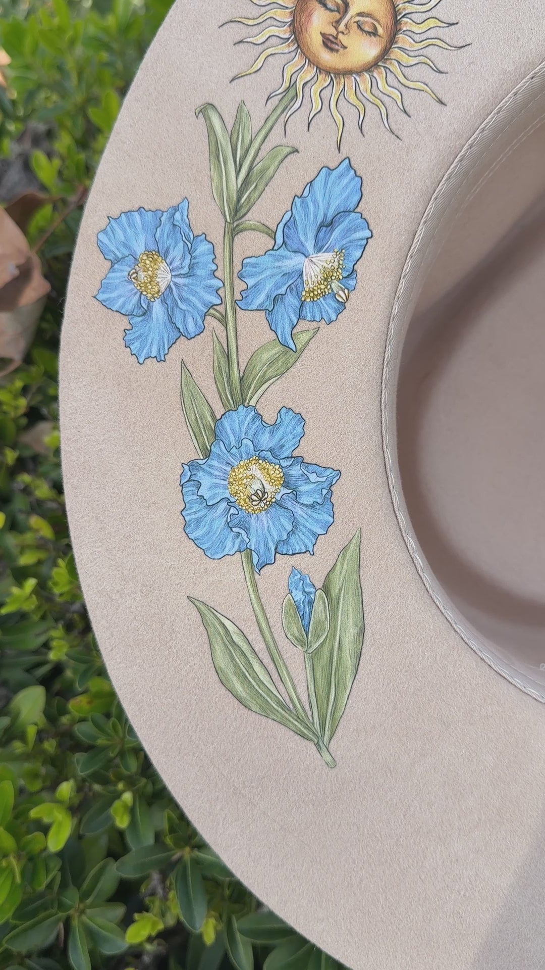 The Juno Rancher features hand-applied artwork by Leni Lupin. Also available in western style. Each hat is a one-of-a-kind piece of wearable art.