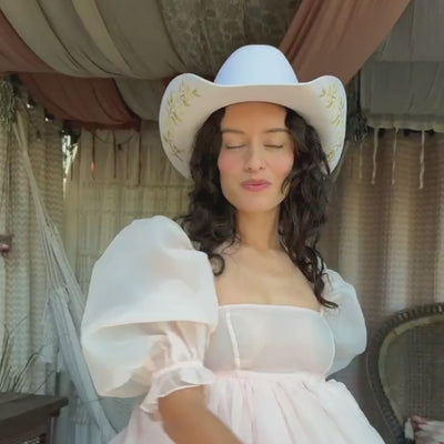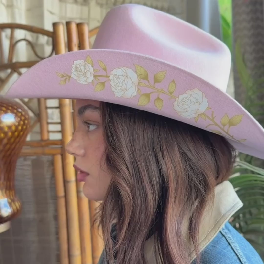 The Pearl Western features hand-applied artwork by the Wild As Heck design team. Available in white and pink. Each hat is a one-of-a-kind piece of wearable art.