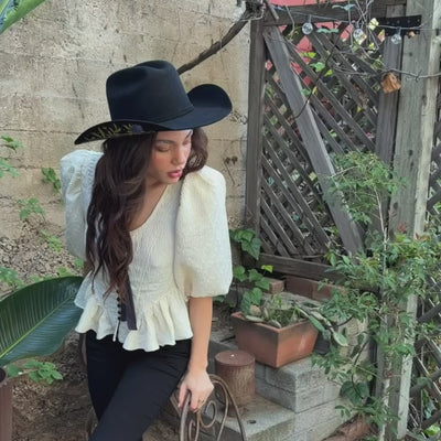 The Solstice Western features hand-applied artwork by the Wild As Heck design team on a cowboy silhouette. Also available as a rancher. Each hat is a one-of-a-kind piece of wearable art.