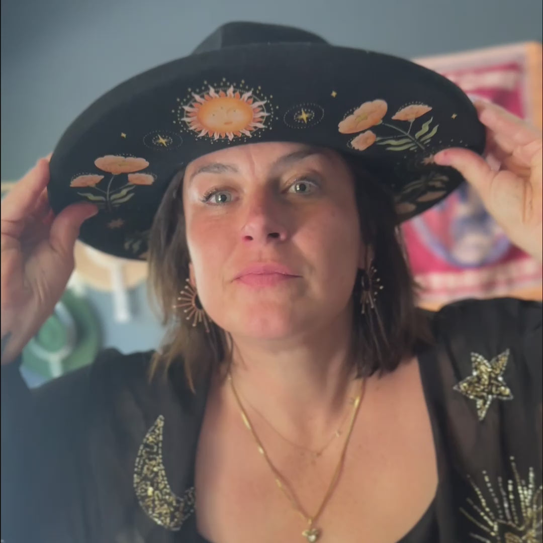 The Stevie — named after our favorite witchy musician — features celestial and floral artwork by Leni Lupin, inspired by nature and the ethereal. The pencil brim has a rolled edge and firmer structure than a traditional rancher. Each hat is a one-of-a-kind piece of wearable art.